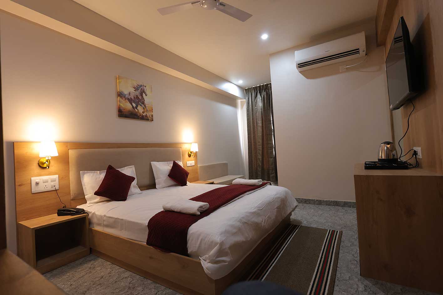 The Deluxe Rooms consists of 1 Double Bed. It is simple and comfortable stay for two. The rooms are equipped with 32” LED TV, a work space with a writing desk, an intercom, a centre table with armchairs, tea-maker with an attached bathroom with 24 hrs hot & cold running water and toiletries, neat & sanitized linen, and all modern fittings and amenities. So whether you return to hotel after a hectic day at office or for admission or as devotee, you will be glad to receive our hospitality where we are ever ready to serve our guests 24×7.
